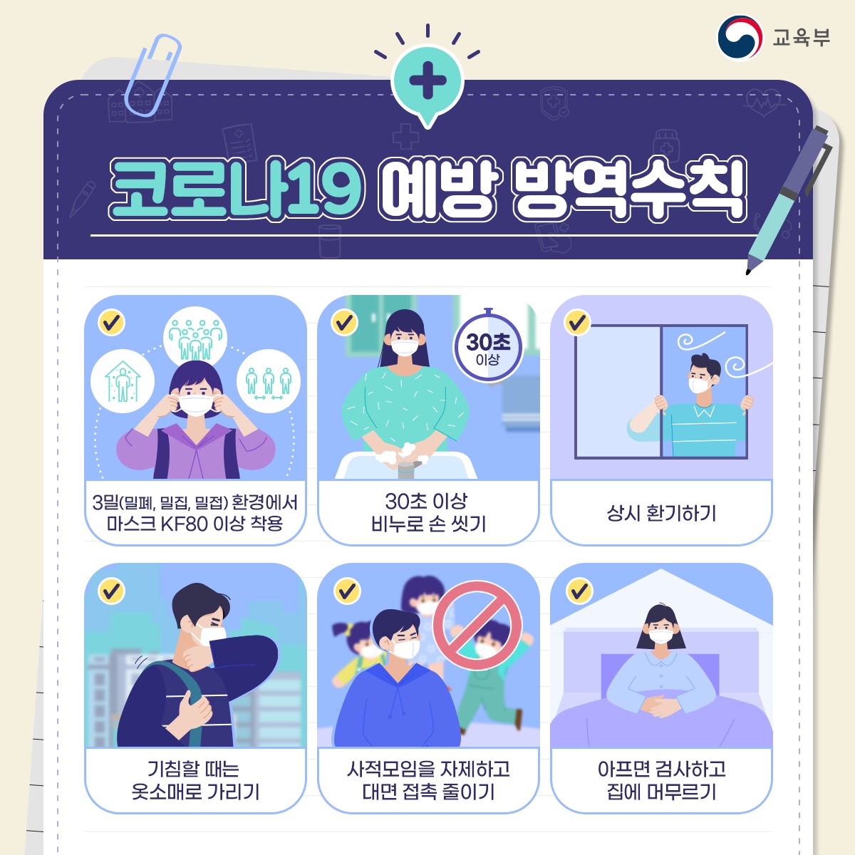 나와 가족, 교육공동체의 안전을 지키고, 2022학년도에도 코로나19로부터 안전하게 등교수업을 이어갈 수 있도록 사람 많은 곳 출입 가능한 자제, 손 씻기 등 개인위생 및 방역수칙 준수를 당부드립니다.