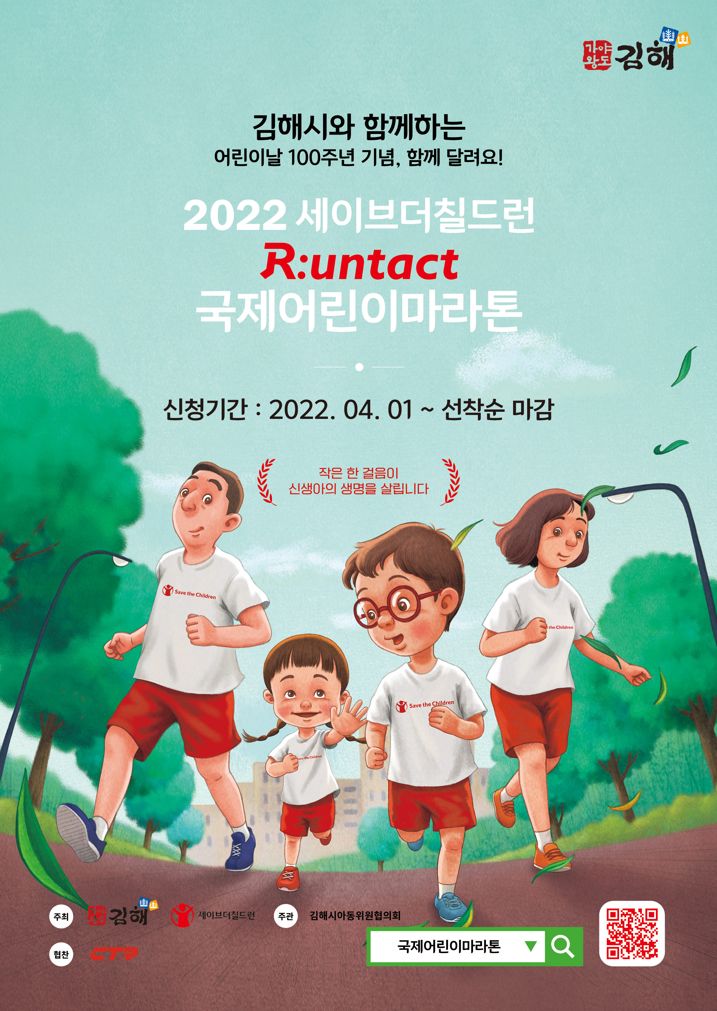 김해시와 세이브더칠드런이 함께 여는 어린이날 기념 행사 【R:untact국제어린이 마라톤】 ○ R:untact : 비대면으로 안전하게달리는(Run)마라톤의 의미를 담아R+untact, ‘코로나19 감염 확산 방지’를 위해비대면 방식의자율 마라톤 코스를 개인이 완주(4Km)하는 방식 ○ 온라인 신청기간 :`22. 4. 1.(금) ~ 선착순 마감 ○ 자율 마라톤기간 : `22. 5. 5.(목) ~ 5. 7.(토) ○ 참 가 비 : 1인 15천원(참가비 전액 기부)/신생아살리기 모자보건사업 전액 사용 ○ 참가신청 : 국제어린이마라톤 홈페이지(www.sc.or.kr/marathon) ○ 공동주최 : 김해시, 세이브더칠드런, 연합뉴스 ○ 주 관 : 김해시아동위원협의회 ※ 어린이날(5월 5일) 수릉원 오프라인 행사 예정(기념식 및 전시행사)