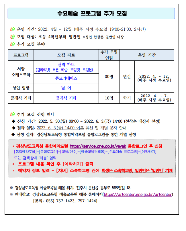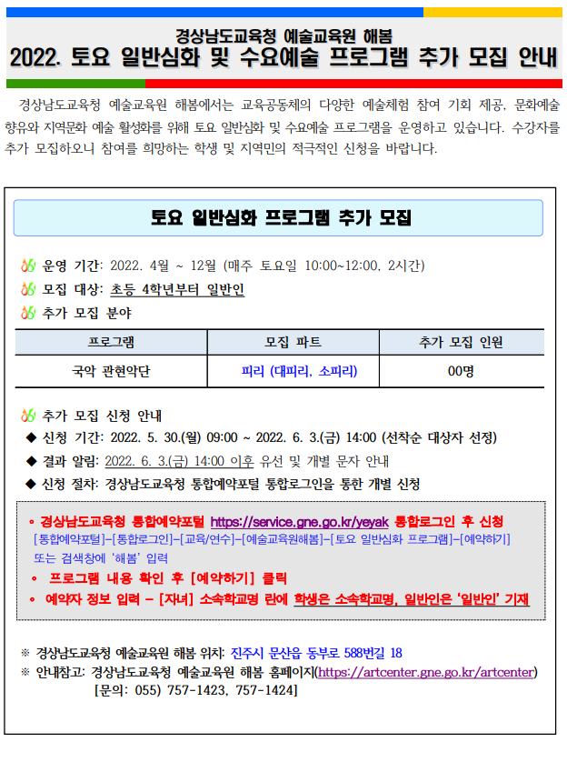 경상남도교육청 예술교육원 해봄 토요 일반심화 및 수요예술 프로그램 추가 모집 안내
