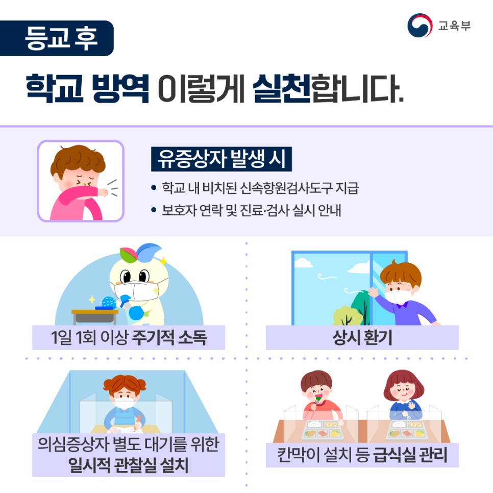 코로나19 재유행으로 학교와 가정, 일상에서 철저한 방역이 요구되고 있습니다. 2학기에도 우리 학생들이 등교를 통한 온전한 배움을 이어갈 수 있도록 학생, 학부모, 교직원 모두 자율과 책임을 바탕으로 일상방역의 생활화, 마스크 올바른 착용, 손 자주 씻기, 상시환기 등 개인위생 및 감염예방 수칙의 철저한 준수를 당부드립니다. 감사합니다. ▶ 일상방역의 생활화(6대 방역수칙): http://ghsinan-p.gne.go.kr/ghsinan-p/na/ntt/selectNttInfo.do?nttSn=87294032&mi=563819