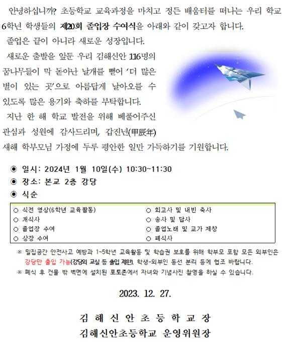 2023학년도 제20회 졸업장 수여식 행사 안내
