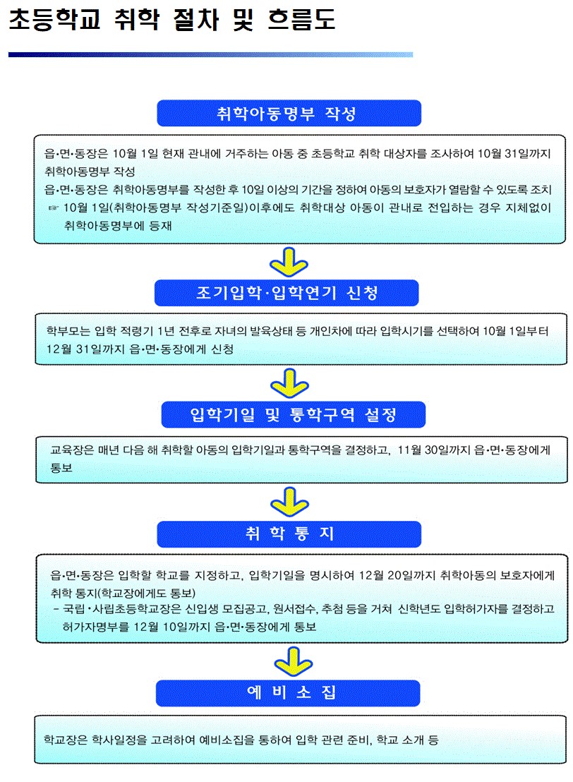 2025학년도 초등학교 취학 절차(경상남도 김해교육지원청)에 대해 첨부와 같이 알려드리니, 2025학년도 자녀의 취학 관련 내용(기간,절차,방법 등) 참고하시기 바랍니다.☞ 조기입학 및 입학연기 신청기간 (2024. 10. 1.~ 2024. 12. 31.), 보호자→읍·면·동 주민센터 신청서 제출