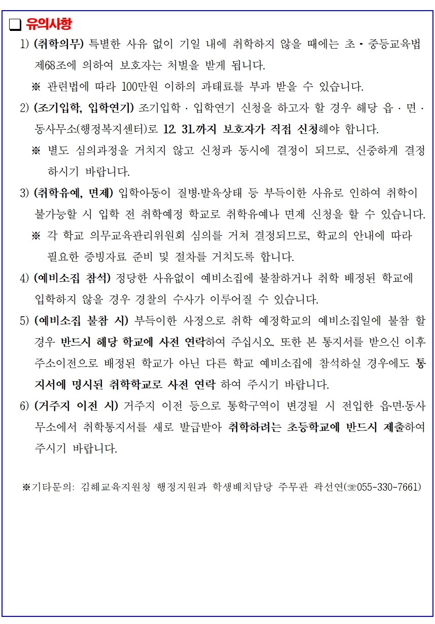 1. 2025학년도 김해신안초등학교 예비소집일: 2025.1.7.(화) 10:00 체육관(2층 강당) 2. 2025학년도 초등학교 입학일: 2025.3.4.(화) 10:00 3. 예비소집 및 입학안내 : 관할 주민센터에서 취학통지서 발급시 취학 안내장(첨부) 함께 발송 ※ 예비소집일 아동 동반 원칙, 거주지 이전 등으로 취학통지서에 기재된 학교와 취학하고자 하는 학교가 다를 경우 두 학교 모두 연락(아래 유의사항 필독)